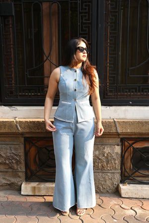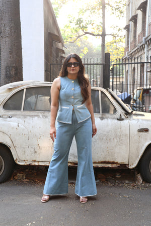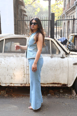 Aqua is a classic aesthetic vest co-ord with minimal anchor thread detailing paired with bell bottom pants with minimal statement