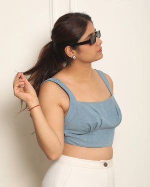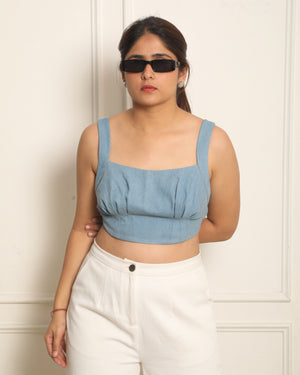 Introducing the Ava Top in classic blue denim. This crop top features a detailed cut out and tie up back. Perfect for any casual or dressy occasion.