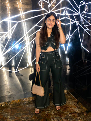 Bell bottom pants paired with a vest with white anchor thread detailing and golden metallic finished buttons completing the glam look