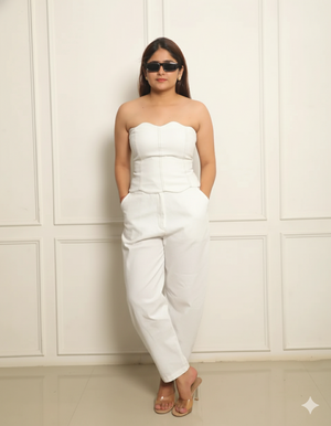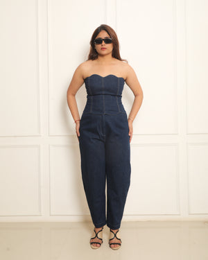 The Cecilia Co-ord is a midnight blue denim set that includes a scalloped tube top in a corset style, complete with a tie-up back for a flattering fit. Paired with barrel denim jeans, this stylish set will make you stand out in any crowd.