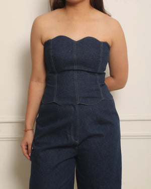 The Cecilia Top in a midnight blue denim that includes a scalloped tube top in a corset style with a tie up back