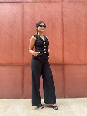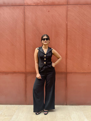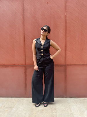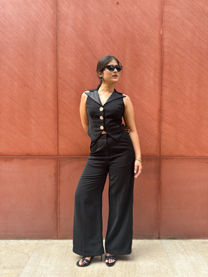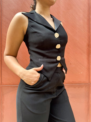 A sleek black vest co-ord with a satin collar for a polished look. Perfect for shopping, wining and dining.