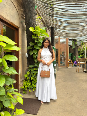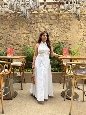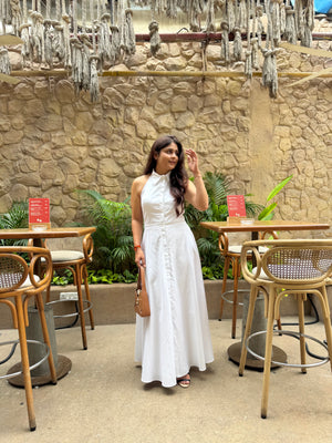 Crafted in crisp white with a sleek button-down front and flowing silhouette, this piece is your ultimate day-to-night essential.