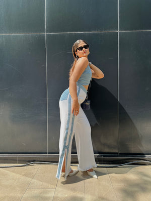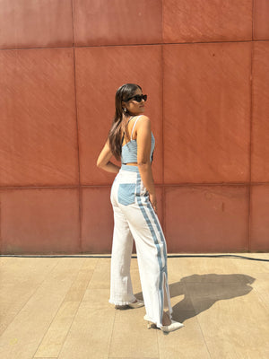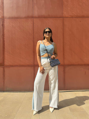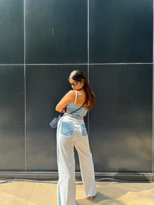 Eliza being a must-have in our wardrobes. Exploring the world of denim with our signature anchor thread detailing. With a bustier top featuring intricate anchor thread detailing and standout cut pants with detailed throughout the length of the pants and signature pockets.