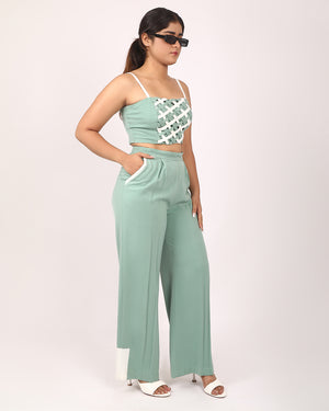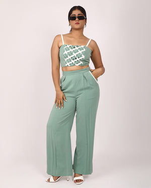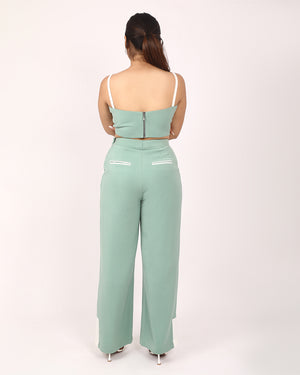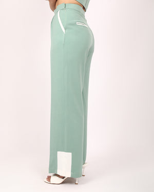 The cropped top features a statement white lattice weave panel, adding texture and edge to a minimalist silhouette. The matching high-waisted trousers offers white trim details on the pockets and hem, finished in a wide-leg cut that moves gracefully with every step.
