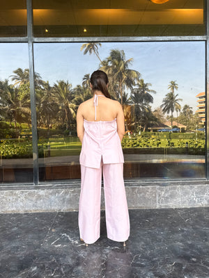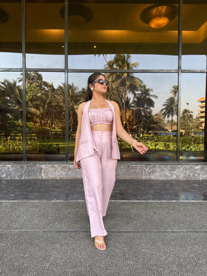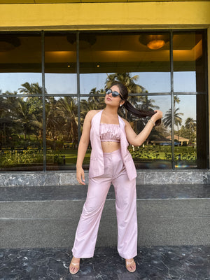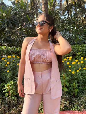 Mabel, is a three piece co-ord with a high waisted trouser, ruched elastic bustier, and an asymmetrically backed waistcoat.