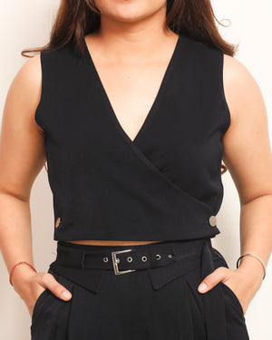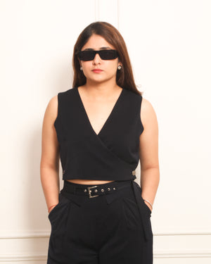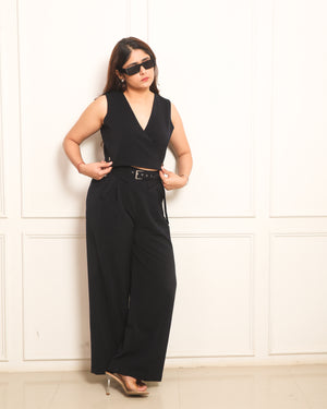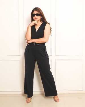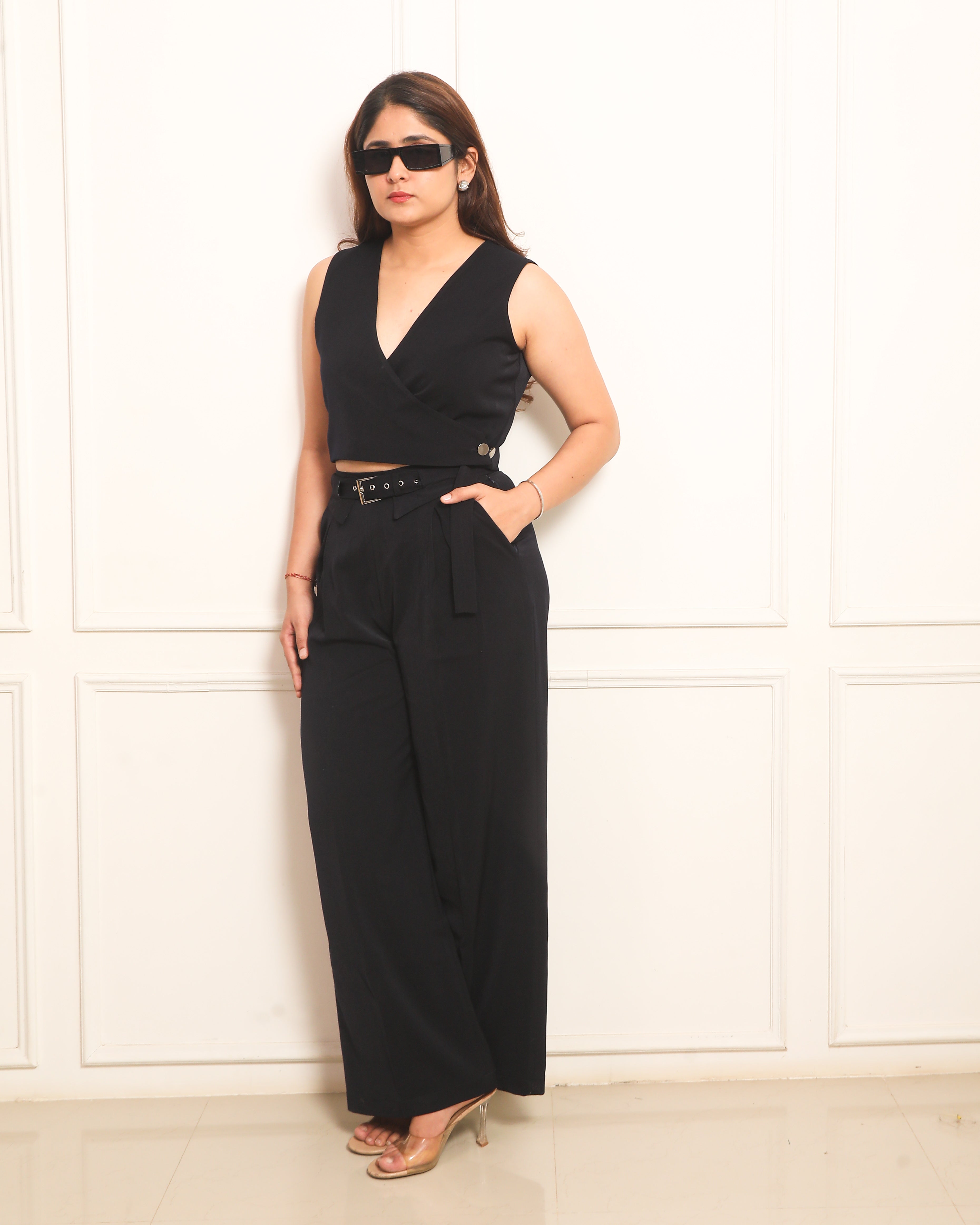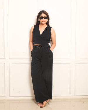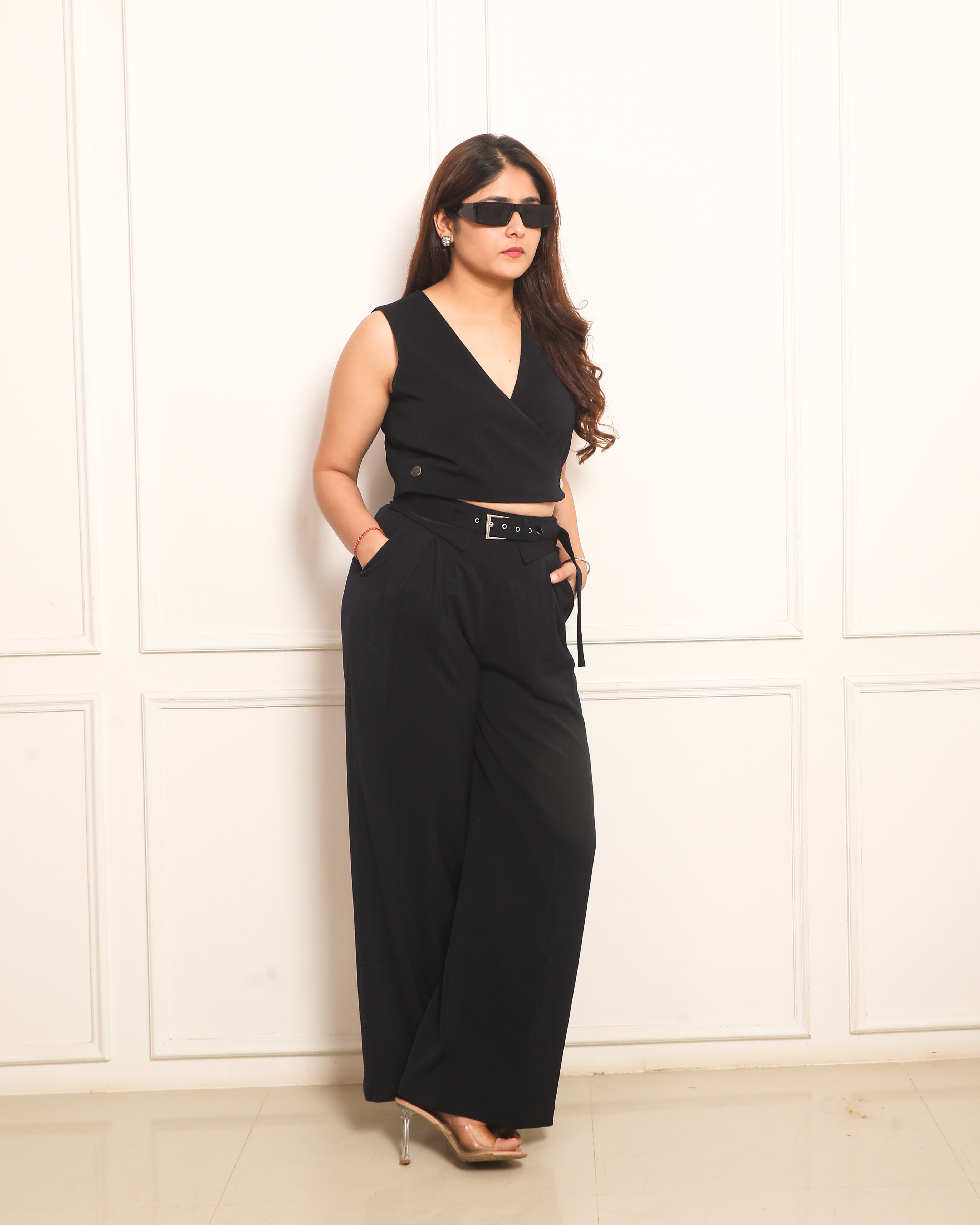 A Navy Muse top paired with tailored wide-leg pants, finished with a structured belt for a sharp, defined silhouette.