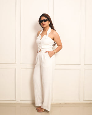 A halter-neck vest with a wave-structured neckline and statement buttons, paired with high-waisted wide-leg pants featuring a sharp V-cut waist. Clean, modern, and effortlessly elevated.
