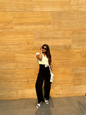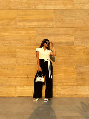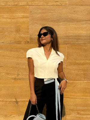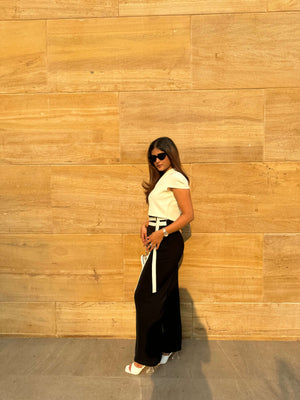 Remi is the ultimate corporate core outfit, featuring high waisted black pants and a chic top, accented by a stylish white contrast belt.