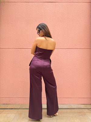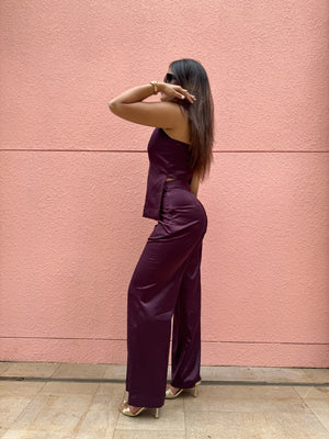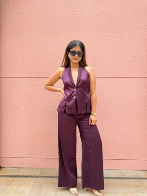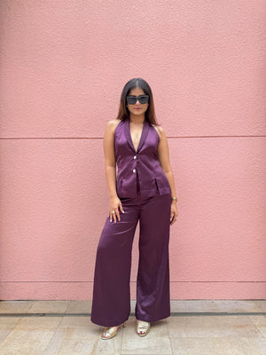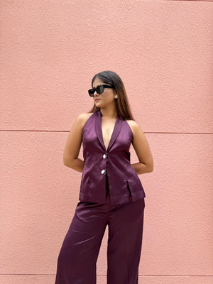 This stylish set combines a halter neck vest with high-rise, straight-leg pants, both crafted from smooth satin fabric. The halter neck top offers a sleek, modern silhouette, while the high-rise, straight-leg pants provide a flattering, comfortable fit. The rich satin finish adds an elegant sheen, making this ensemble perfect for a night out or a refined day look.