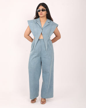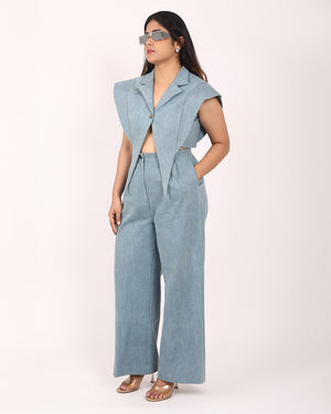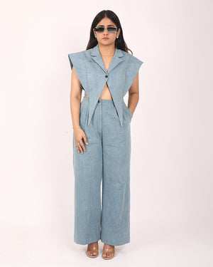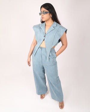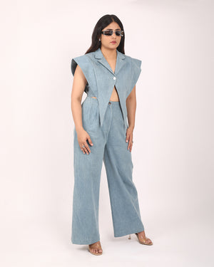 This bold ensemble features a sharply tailored sleeveless blazer with exaggerated angular shoulders and a daring front cut-out, creating a fierce yet flattering silhouette. The matching high-waisted wide-leg trousers offer a clean, elongating fit with side pockets for ease and edge.