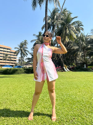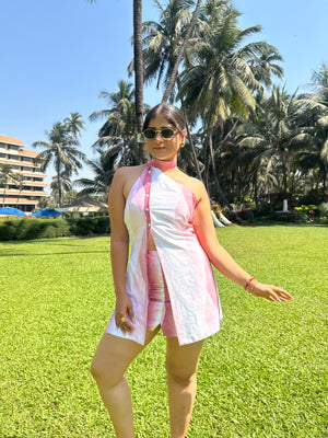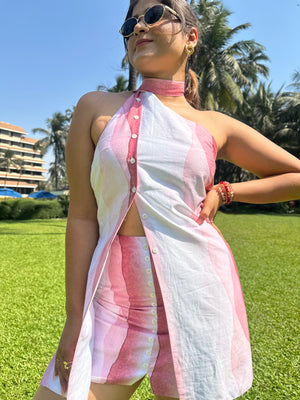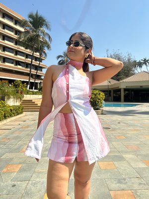 Skye is an asymmetrical halter neck top with a front button opening with a wrapped tie draped around neck paired with a skort
