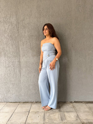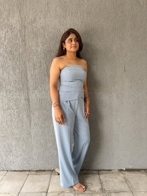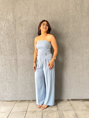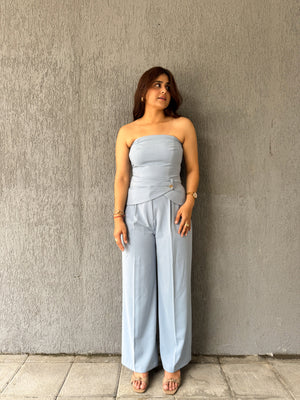 The Skyline Set is a strapless co-ord in pastel blue, featuring a tailored bodice with button detail and flowy wide-leg pants.