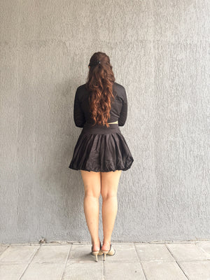A black co-ord featuring a cropped tie-up shirt with full sleeves, paired with a sleek mini skirt. Clean lines, sharp fit, and effortless to style from day to night.