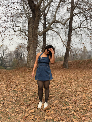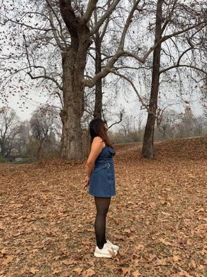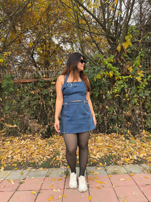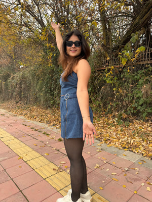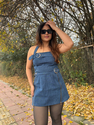 Stella, the ultimate denim on denim combo. Featuring a halter neck top and a matching denim skirt, accentuated with a signature belt for a chic and trendy look. Say hello to effortless style with Stella.